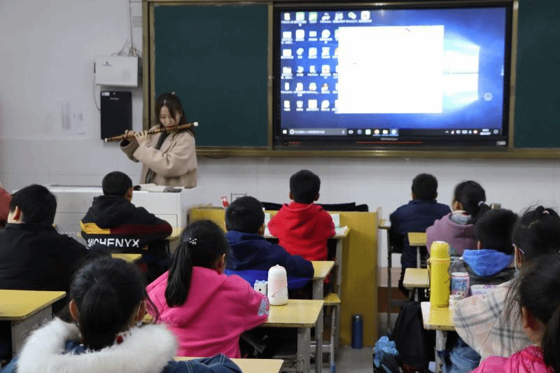 在此次活动中,马雪老师为同心小学四(1)班同学送上了一节别开生面的音乐课。音乐课上,孩子们纷纷举手,开心地与老师进行笛曲欣赏《水乡船歌》互动交流;下课铃声响了,同学们依依不舍地与老师道别,仰着头问道:“老师、老师,谢谢您的课程,您下次什么时候还来?”