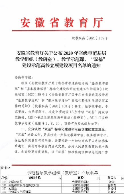 本网讯 近日,安徽省教育厅发布《关于公布2020年省级示范基层教学组织(教研室)、教学示范课、“双基”建设示范高校立项建设项目名单的通知》,必赢官网新能源材料与器件教研室成功获批为省级示范基层教学组织。
