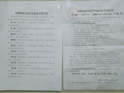 组织签名活动,推动安全入脑入心。学院各年级辅导员组织全体学生签订《必赢线路检测中心学生宿舍安全承诺书》,并安排学生将《必赢线路检测中心学生宿舍文明公约》张贴在宿舍墙上,各年级学生纷纷参与进来,通过签名活动来践行自己的安全承诺。