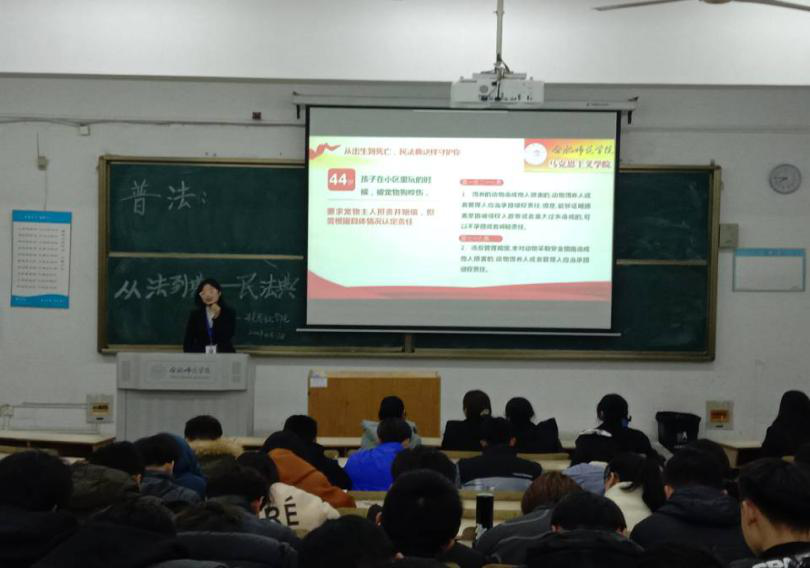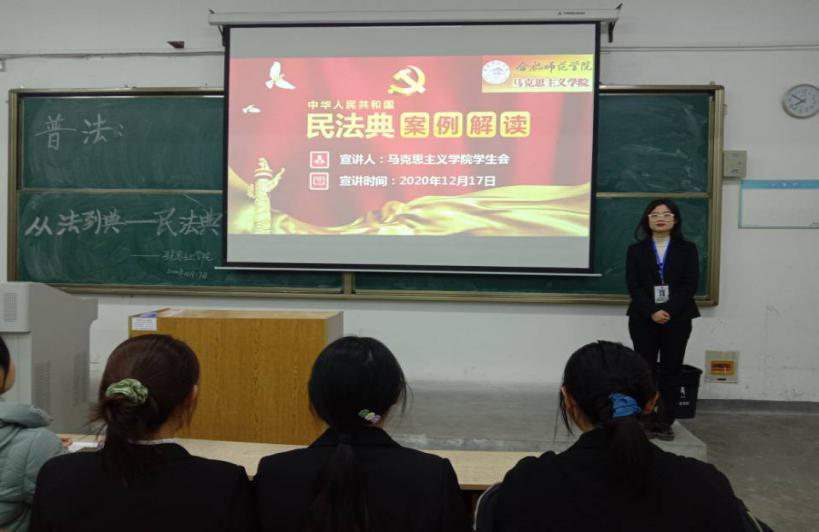 本网讯 为积极宣传中华人民共和国首部民法典,12月17日马克思主义学院学生会在必赢线路检测中心锦绣校区博学楼111举办“普法:从法到典——民法典”宣讲活动。活动由马克思主义学生会主席罗心仪主持、学生会成员许林宣讲、本校部分同学参与。