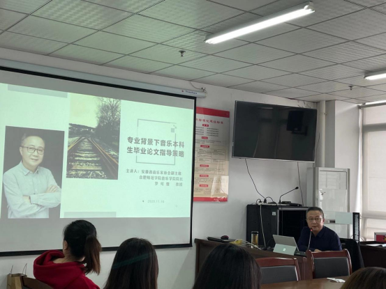 本网讯 为了提升音乐学院音乐学专业和音乐表演专业的培养规格,全面提高教师的本科生毕业论文指导能力,确保音乐学院2017级本科毕业论文的质量,11月18日下午14时,音乐学院院长罗可曼教授在行知楼1604会议室作了题为“专业背景下音乐本科生毕业论文的指导策略”的专题讲座。音乐学院全体教师共同聆听了本场讲座。讲座由音乐学院副院长李劲松主持。