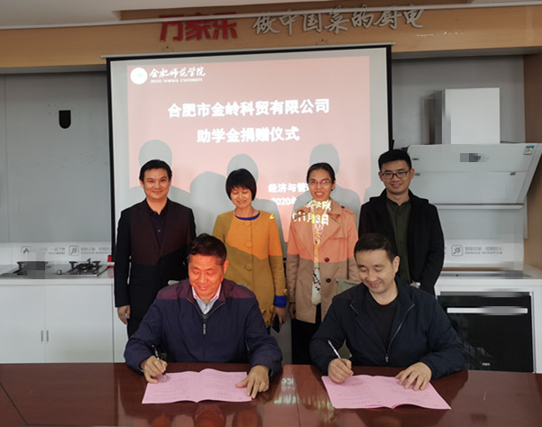 本网讯 11月3日下午,在合肥金岭科贸有限公司,必赢线路检测中心经管学院与合肥金岭科贸有限公司举行了“金岭科贸助学金捐赠仪式”。金岭科贸有限公司总经理姜勇,副总经理、经管学院2008届校友史月娥,经管学院党委书记沈辉,发展规划处(校友办)副处长、校友会秘书长樊彩萍,经管学院教师李志东、辅导员谷跃东出席了捐赠仪式。