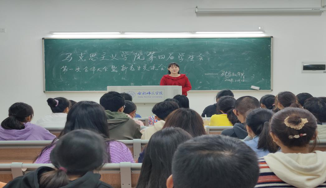 本网讯 为加强锦绣校区和滨湖校区学生会成员之间的沟通交流,增进新生对学生会相关工作的了解,指导新生更好更快的适应大学生活。11月1日马克思主义学院在滨湖校区博学楼B109教室开展了第四届学生会第一次全体大会暨新老生交流会,本次活动由马克思主义学院2018级学生会主席罗心仪主持,学生会各部门负责人及2020级全体新生参加。