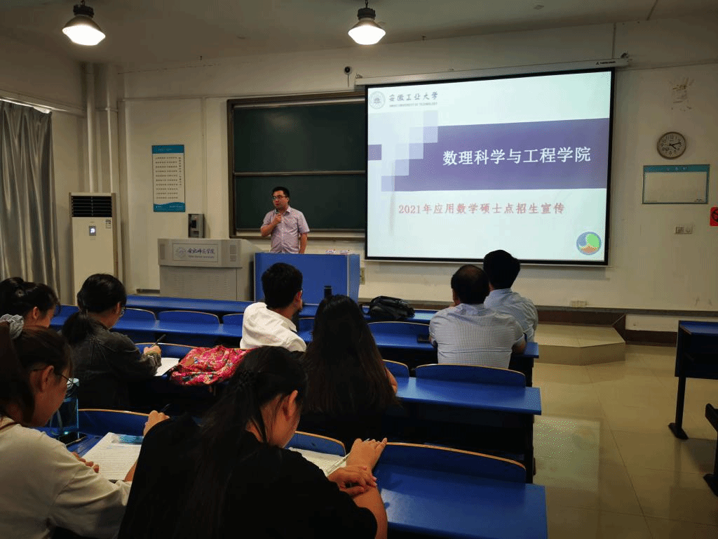 首先,安徽工业大学数理科学与工程学院系主任杨刘分别从安徽工业大学及数理科学与工程必赢官网、应用数学硕士点概况、学科和研究方向、培养条件与成果等方面进行了详细讲解,重点介绍了学院在师资队伍、研究方向、人才培养等方面的优势,鼓励我校学子积极报考,实现人生理想。