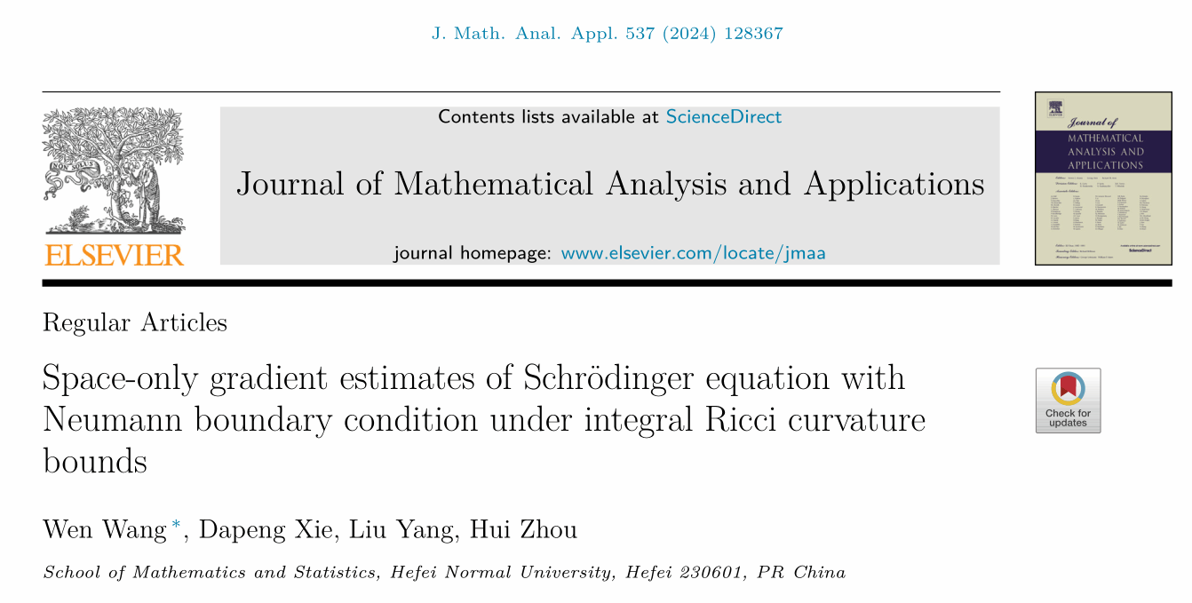 近期,数学与统计学院“基础数学”省级重点学科微分方程与动力系统团队教师王文、解大鹏、杨刘、周辉在几何偏微分方程方向取得进展,相关成果Space-only gradient estimates of Schrödinger equation with Neumann boundary condition under integral Ricci curvature bounds在JCR二区期刊《Journal of Mathematical Analysis and Applications》公开发表。