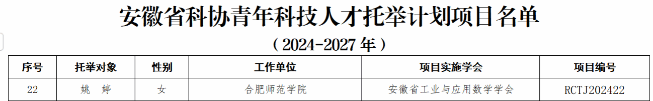 近日,安徽省科协公布了安徽省科协青年科技人才托举计划(2024-2027)入选者名单,数学与统计学院青年教师姚婷成功入选。