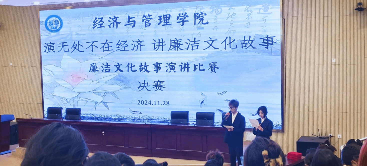 在深入学习贯彻党的二十届三中全会精神和习近平总书记考察安徽重要讲话精神之际,11月28日,由经济与管理学院党委主办、院学生会承办的“演无处不在经济,讲廉洁文化故事”演讲比赛决赛在滨湖校区报告厅举行。学院党委副书记、纪委书记陶敏,副院长钟玉文,教师代表刘经涛、许凤妹,辅导员曹国志、王瑞瑞、高劲成担任评委。滨湖校区2023级、2024级150余名学生参加。