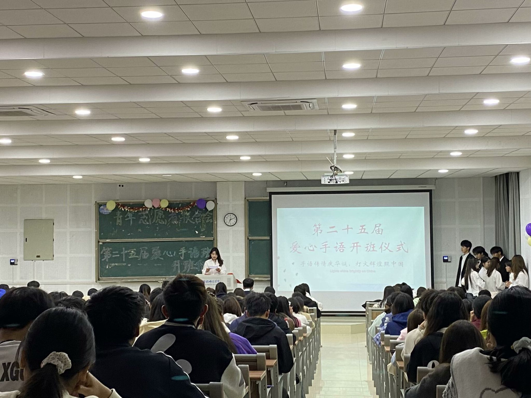 开班仪式上,青志联教学人员带来手语操表演《灯火里的中国》,激昂有力的歌声搭配协调一致的手语表演,深刻传递了同学们对祖国的美好祝福,展现了新时代青年的家国情怀。在随后的教学环节中,青志联成员们分布在讲台和两侧过道,向在场的同学详尽指导手语的细致动作,清晰展示技巧要点,并和同学们展开积极互动。本届爱心手语班累计开展了4次手语操教学活动,全院同学热情高涨参与活动,反响热烈。随着活动的深入,同学们不仅掌握了实用的手语技能,也加深了对听障人士生活方式的认知,感受到了无声世界的力量。