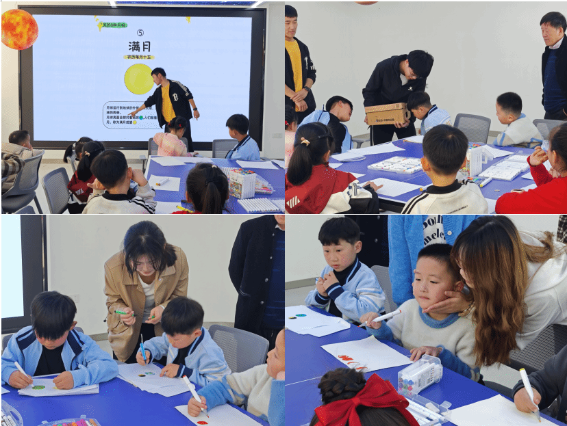 最令人期待的当属实验环节,志愿者们带领大家一起动手作画,描绘月相变化过程。通过简单的道具和巧妙的操作,抽象的天文知识变得直观易懂,孩子们积极参与,在实践中增强了对月亮的认识,也体验到了科学带来的无限乐趣。