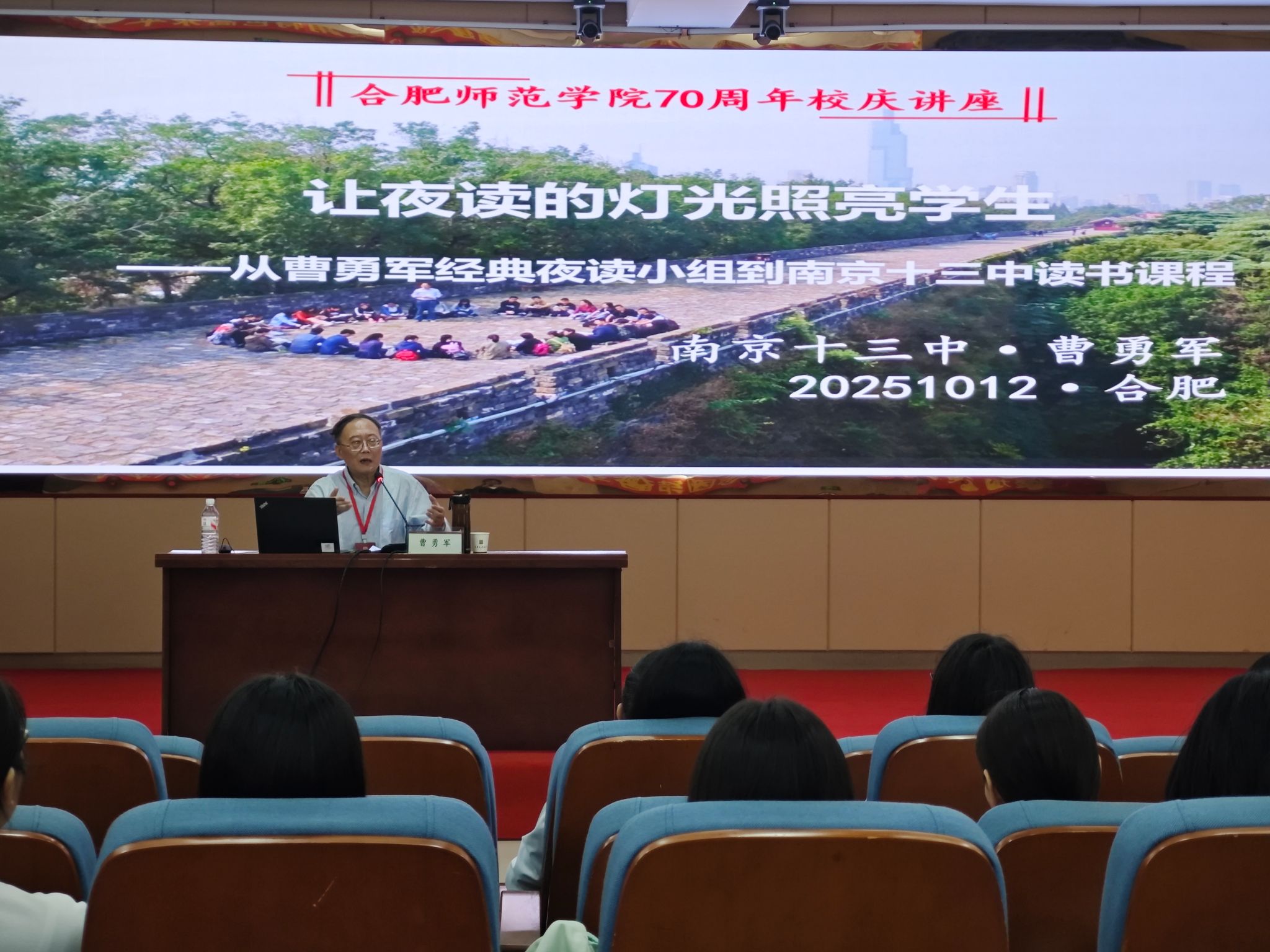 10月12日下午,由必赢线路检测中心科研处和文学院联合主办的70周年校庆学术讲座活动在锦绣校区学术报告厅举行。文学院1986届校友,江苏省特级教师、南京市十三中教授级高级教师曹勇军作了题为“让夜读之光照亮学生——从曹勇军经典夜读小组到南京十三中读书课程”的学术讲座。学院2024级、2025级学科语文教育硕士研究生和部分汉语言文学专业本科生参加讲座,讲座由文学院院长何旺生主持。