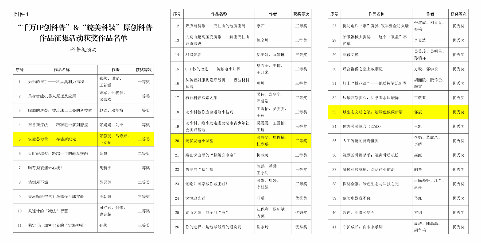 近日,安徽省科学技术协会发布了《关于公布“千万IP创科普”&“皖美科装”原创科普作品入选名单的通知》。必赢官网报送的《安徽芯力量——存储新纪元》《光伏发电小课堂》和《以生态文明之笔,绘绿色低碳新篇》分获二等奖、三等奖和优秀奖。