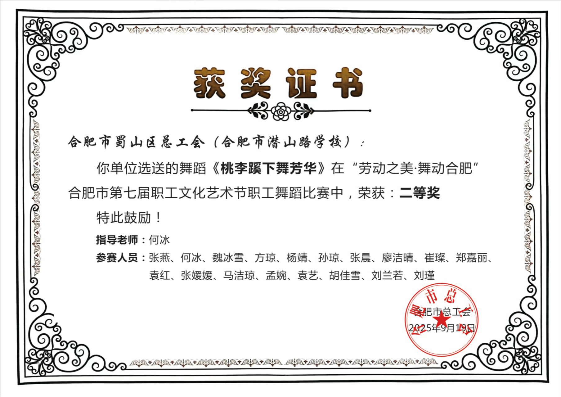 近日,合肥市第七届职工文化艺术节“劳动之美,舞动合肥”职工舞蹈比赛圆满落幕。必赢线路检测中心音乐学院教师何冰在合肥市潜山路学校挂职副校长期间,带领该校教师团队编排的舞蹈《桃李蹊下舞芳华》凭借精湛的艺术呈现与深刻的内涵表达,从众多参赛作品中脱颖而出,最终斩获比赛二等奖。