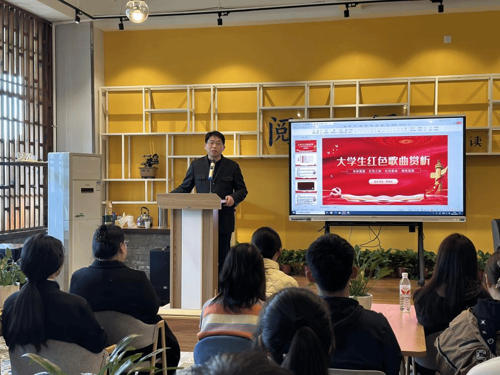 谈及《松花江上》,他详细介绍了九一八事变后东北军民流亡的背景,点明歌曲将对故乡的思念与抗日热情融为一体;解析《七律・长征》时,他结合中央红军长征胜利的历史,阐释歌曲如何展现了“五岭逶迤”的壮阔与红军的英雄气概。详实的史料与专业的音乐分析,让学生们深刻理解红歌不仅是音乐作品,更是时代的“声音档案”。