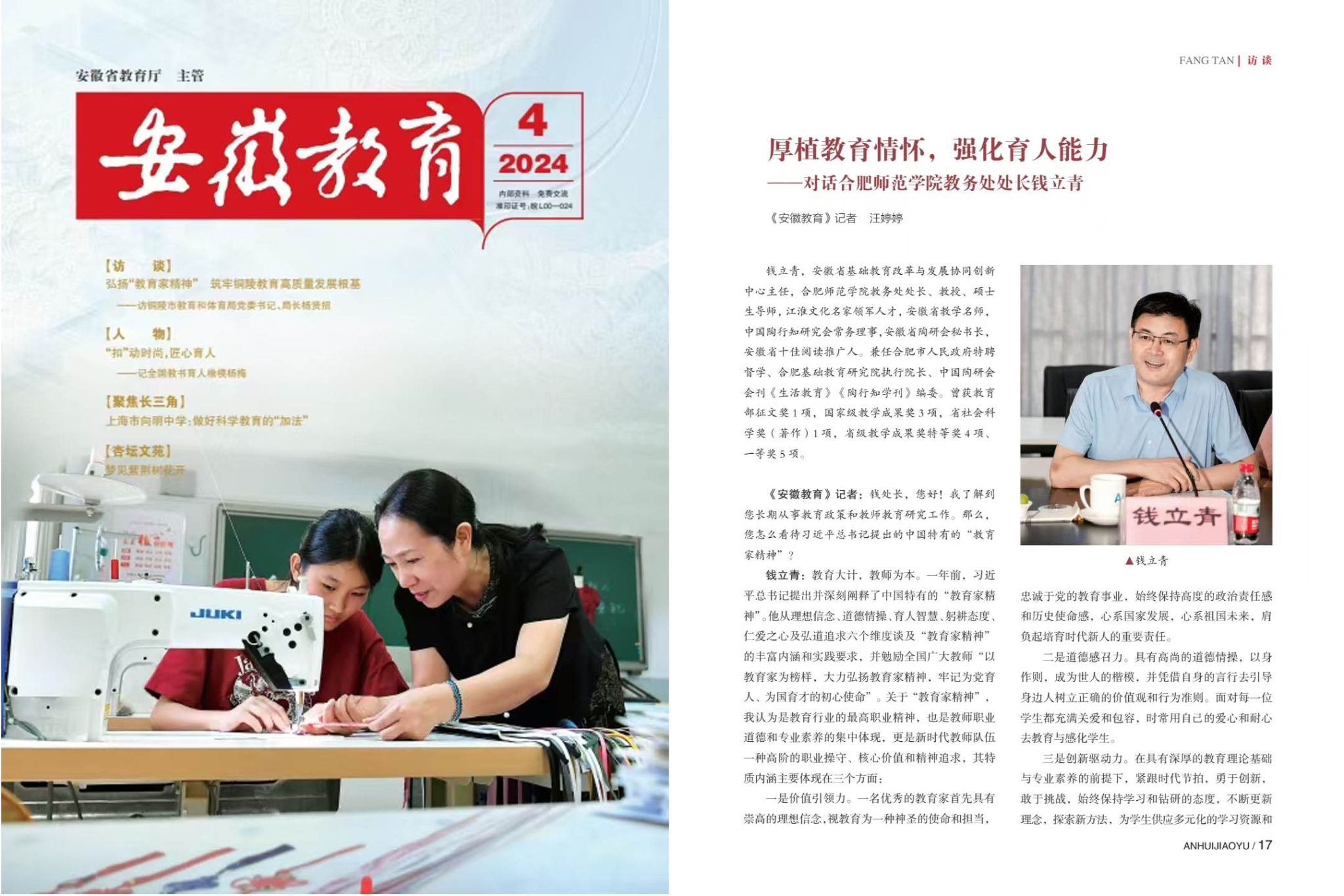 全国第 40 个教师节,安徽省教育厅教育宣传中心在《安徽教育》开设了“访谈”栏目,邀请我校教务处处长钱立青教授等5位教育专家,围绕“教育家精神”、新时代教师队伍建设等话题进行深度对话交流,展示我省新时代高素质专业化教师队伍建设的突出成就和教育工作者立德树人、自信自强的精神风貌。采访内容刊发于今年第4期《安徽教育》。